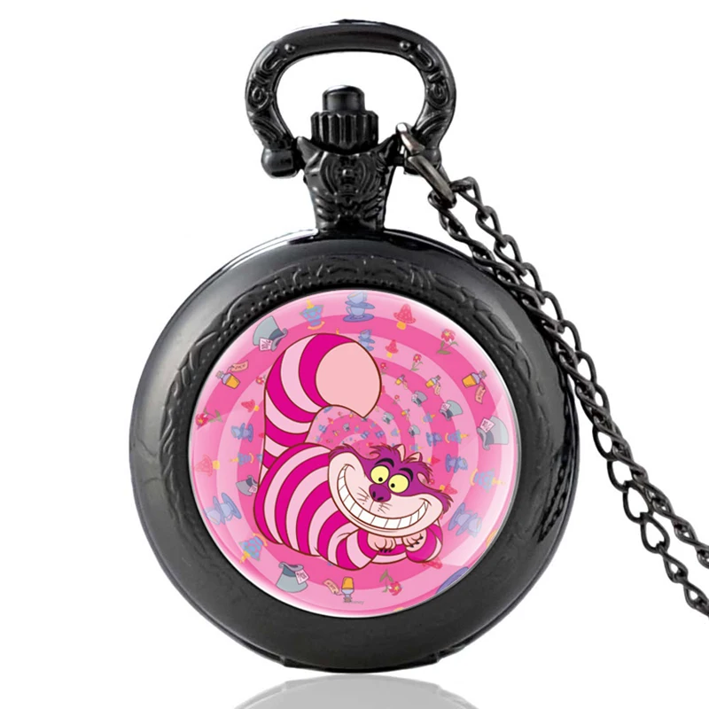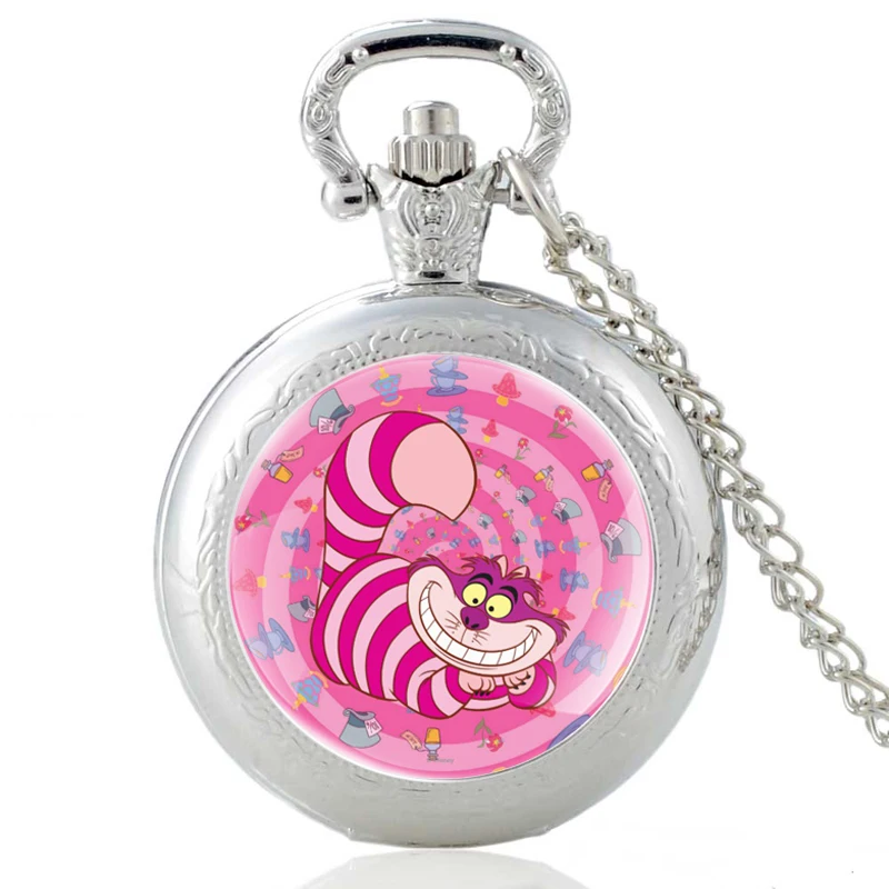 Модные серебряные кварцевые карманные часы с кабошоном в виде кота страны чудес, винтажные мужские и женские часы с подвеской и ожерельем, подарки