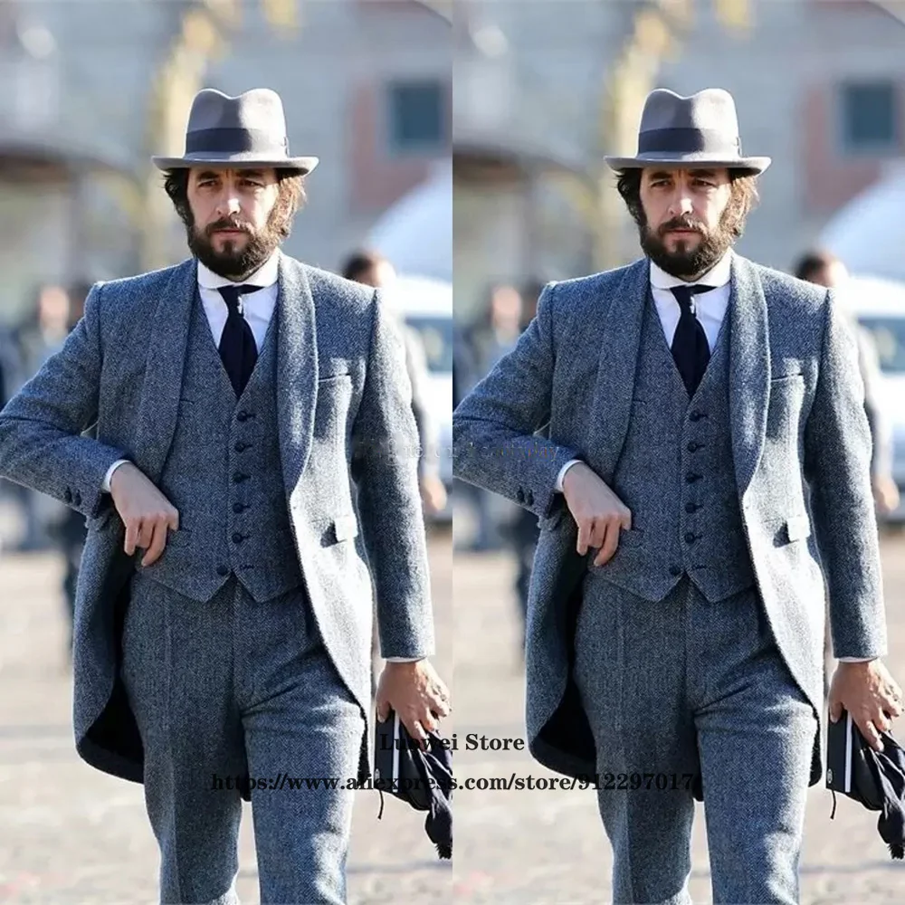 Зимние твидовые мужские костюмы в елочку для жениха, свадебный смокинг, шерстяной пиджак, жилет, брюки, официальный деловой пиджак для мужчин