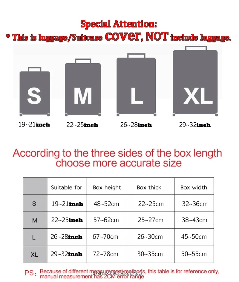 Пожалуйста, обратите внимание Это чехол для багажа/чемодана, в комплект не входит багаж.* Все фотографии и цвета могут немного отличаться из-за освещения студии.* Настройка. Пиксель вашего индивидуального изображения должен быть не менее 800*800 Пожалуйста, обратите вниманиеРазмеры1 дюйм = 2,54 смЭластичный Чехол для багажаРазмер S: подходит для 18,21 дюймового чемоданаРазмер M: подходит для багажа 22,24 дюймаРазмер L: подходит для багажа 25,28 дюймаРазмер XL: подходит для багажа 29,32 дюймаТип закрытия: молния