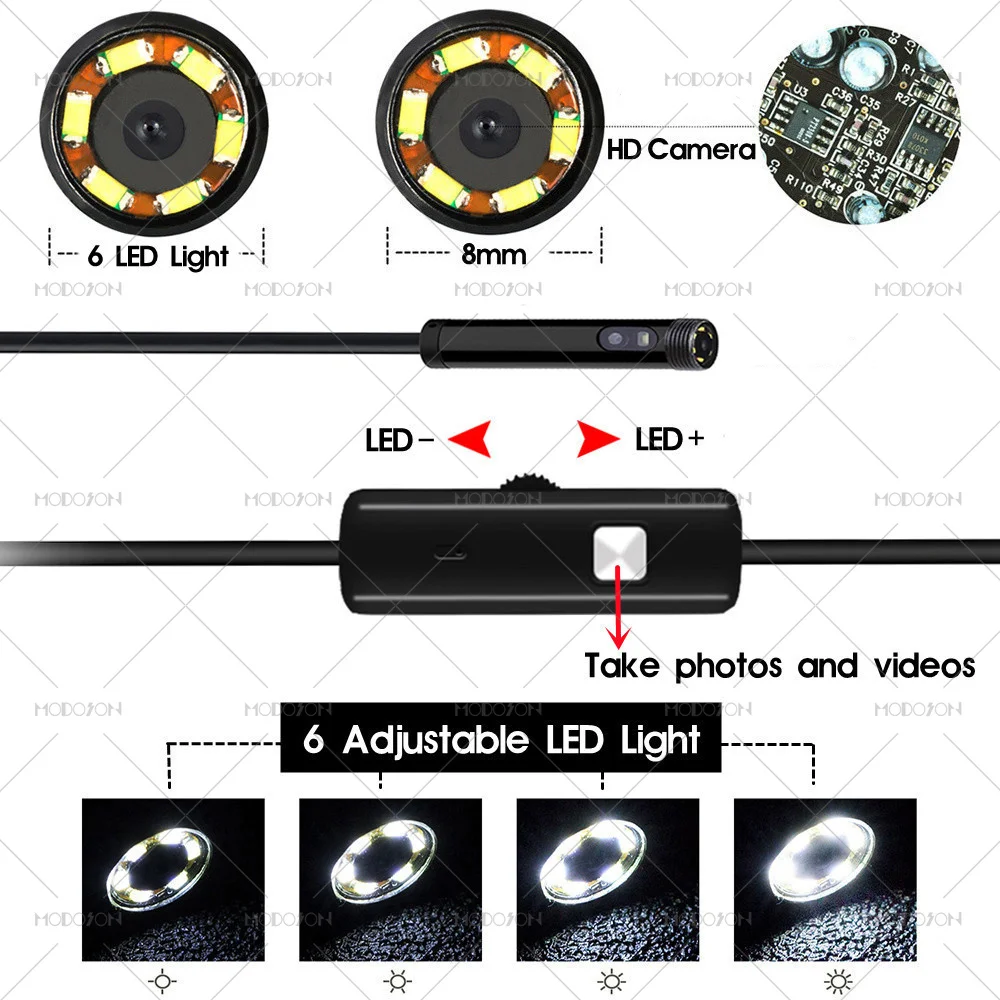 ● Длина кабеля: 1 м, 2 м, 5 м, 10 м на выбор● Стиль Кабеля: мягкая и жесткая линия на выбор● Диаметр объектива: двойной объектив 8 мм● Светильник: 6 шт. регулируемый светодиодный светильник• Фокусное расстояние: 3 см-10 см (1,18-3,94 дюймов)● Уровень водонепроницаемости: Поддержка● Пиксель объектива: 2.0MP● Разрешение: 640*480, 1280*720● Угол обзора: 70 °● Система поддержки: для Android/для Windows 2000/для XP/для Vista/для Windows 7/8/10● Usb-порт: Micro USB/Type-C/USB● Размер датчика: 1/5 дюйма● Частота кадров: 30 кадров в секунду● Источник питания: 5 В постоянного тока через USB● Формат фото: JPEG● Формат видео AVI