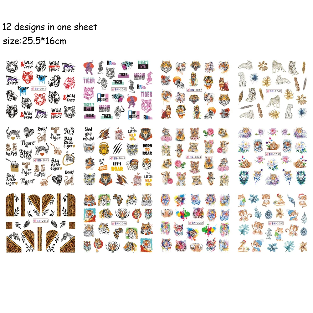 Товар: наклейки для ногтей с изображением тигра на 2022 год Количество: 12 дизайнов в одном листе Размеры: 25,5*16 см Тип: переводные наклейки для воды Рисунок: тигр/принт с животными/буквы/Роза Использование: 2022 Новогоднее украшение для ногтей