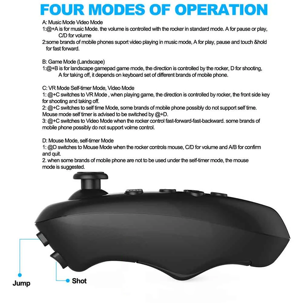 Особенности: В соответствии с эргономичным дизайном-он идет в обтекаемый дизайн на рисунке продукта, он обеспечивает как модный смысл, так и ощущение науки и техники. Они плотно прилегают к вашим пальцам, обеспечивая точность и гибкость. Нулевая задержка, простая процедура сопряжения, отсутствие корня или подключений, простая настройка для игр. 4 режима для музыки и видео; Игры; VR, видео, селфи; Селфи, мышь. С небольшим размером и легким, очень удобно использовать. Параметры Материал: АБС-пластик Цвет: черный, белый Размер (Д x Ш x В): около 130x33x44 мм Батарея: 2 шт. AAA батареи (не входят в комплект) Поддержка: для Andriod и для IOS Посылка включает в себя: 1 шт. пульт дистанционного управления 1 шт. Руководство пользователя Примечание: Благодаря светильник экране монитора фактический товар точно такой же, как на & #039; Невысокий массивный каблук, цвет изделия на фото может быть s светильник ly отличается из-за характеристик монитора компьютера. Замеры сделаны вручную, поэтому возможны 0,5-2 см, связанная с особенностями измерения вручную.
