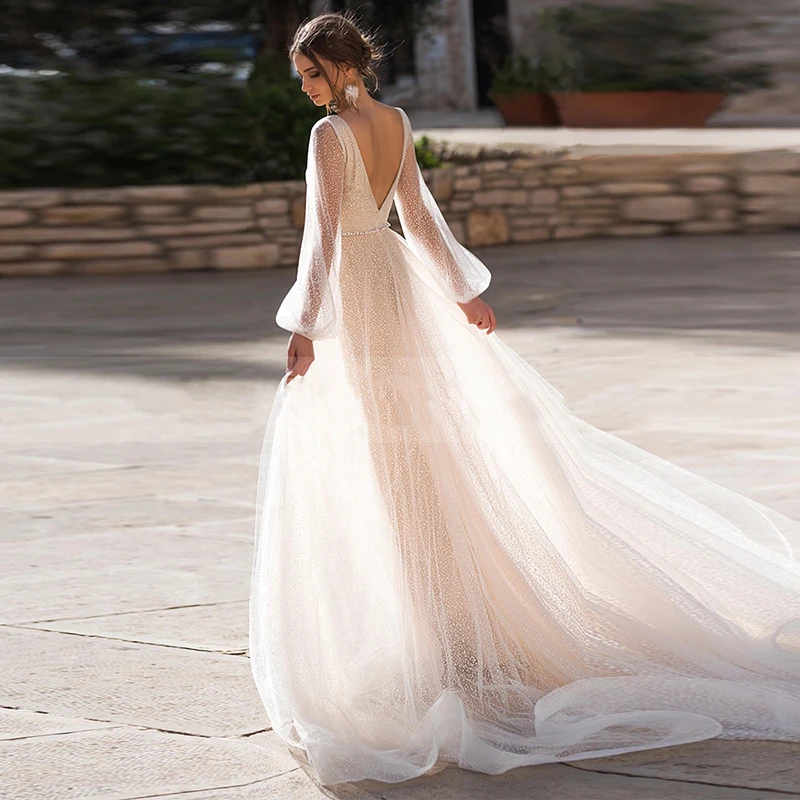 Роскошные трапециевидные Свадебные фатиновые Очаровательные платья с рукавами-фонариками, блестками, V-образным вырезом и поясом с бусинами, сексуальное женское платье с высоким разрезом и открытой спиной
