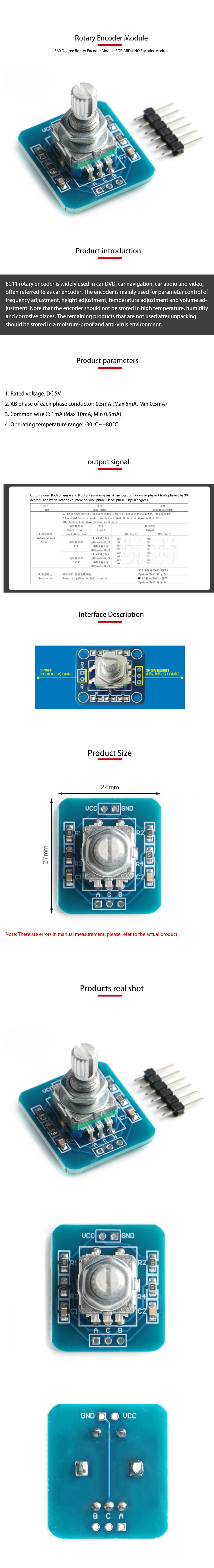 При вращении роторный кодировщик может рассчитываться в положительном направлении и обратном направлении во время вращения выходной частоты импульса, в отличие от поворотного счетчика потенциометра, число вращения которого не ограничено. С помощью кнопок на поворотном кодере можно сбросить до исходного состояния, что начинает подсчет от 0.