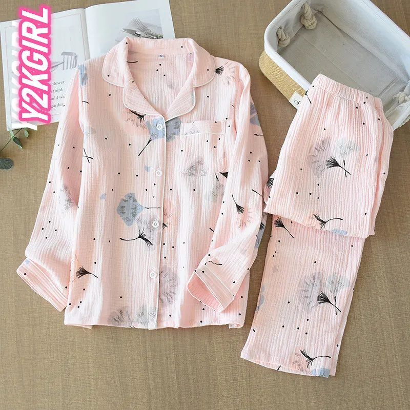 Y2KGIRL кимоно из чистой хлопчатобумажной пряжи, пижама с V-образным вырезом, женская одежда для отдыха, женская одежда для сна из двух предметов, осенняя мода