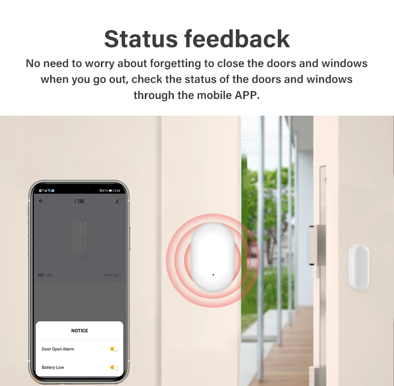 Когда в доме нет человека, если кто-то хочет принудительно открыть двери и окна, датчик двери может быть обнаружен и толкать сообщения через приложение. Сообщите пользователям вовремя, чтобы защитить вашу семью