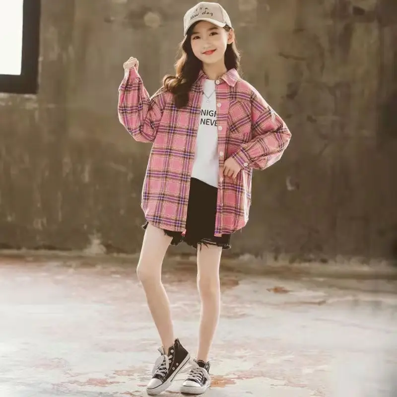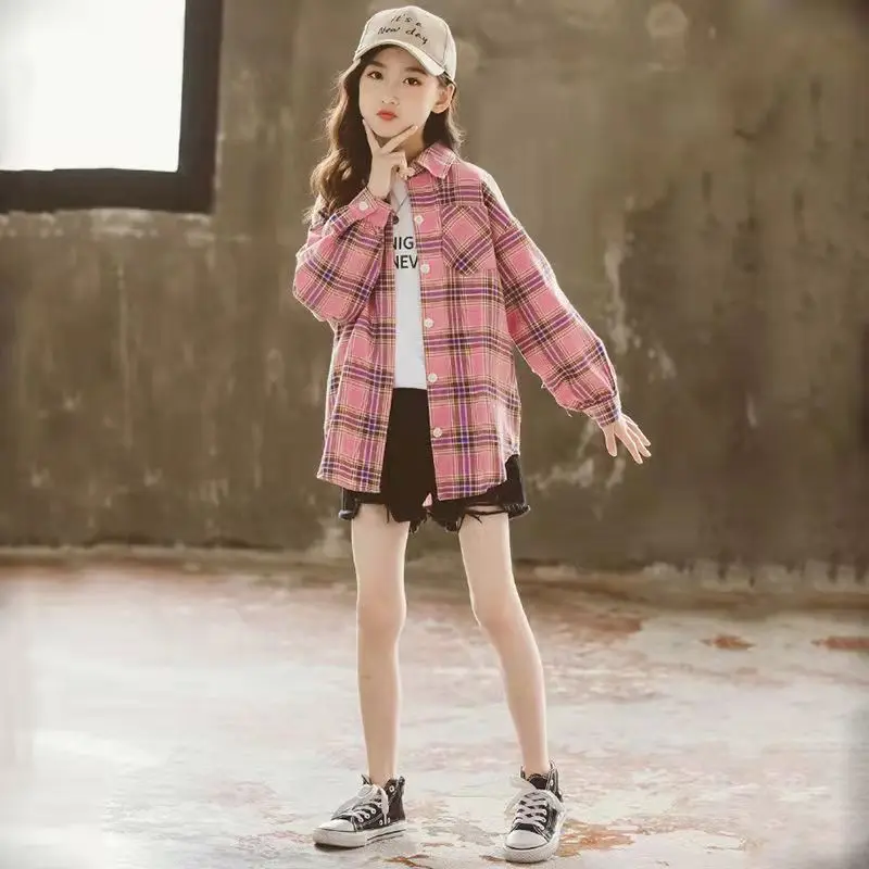 Клетчатые блузки для девочек на весну и осень, Детские хлопковые ру...