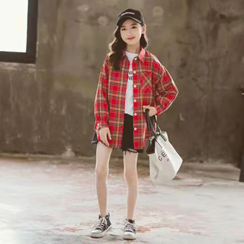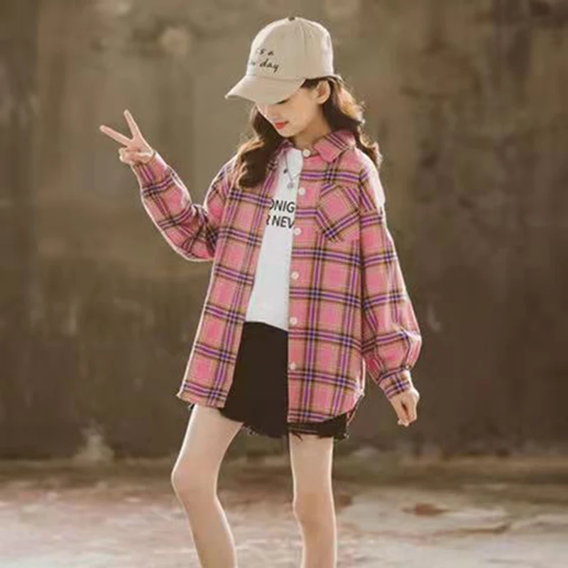 Осенние клетчатые рубашки, блузки и топы для девочек, свободная клетчатая Женская одежда с длинным рукавом, верхняя одежда, зимняя одежда