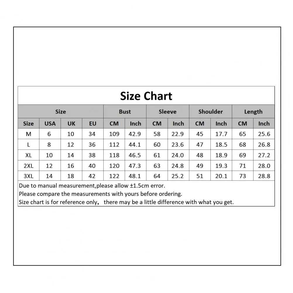 Размер: 3XL, обхват груди: 120 см/47,2 дюйма, длина: 71 см/28 дюймов, длина рукава: 61,5 см/24,2 дюйма, ширина плеч: 49 см/19,3 дюйма (прибл.)