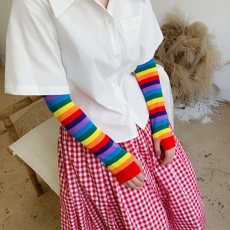 Новинка, Яркий Женский обогреватель для рук, Радужный Цветной полосатый трикотажный солнцезащитный костюм, безпальцевые варежки