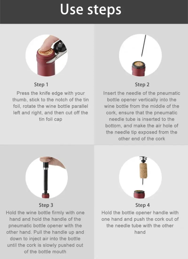 【Эффективный и удобный 】 новейший дизайн, открывалка для бутылок вина под давлением, простой, удобный и весовой светильник. При использовании просто Проколите винную пробку иглой, удерживайте ручку и нарисуйте воздух вверх и вниз 3-7 раз, чтобы вынуть пробку, не уничтожая пробку и бутылку, не производит резку древесины. Он чистый и гигиеничный, и используется для многократной очистки.