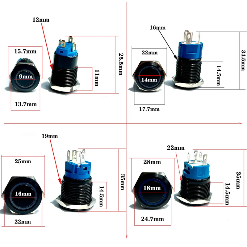 Если вам нужны специальные спецификации, пожалуйста, свяжитесь со службой поддержки клиентов, мы можем настроить их. Контакт: Стерлинговое Серебро Материал: алюминиевый сплав Цвет: черный Светодиодный цвет: белый, желтый, красный, зеленый, синий Номинальная мощность переключателя: 3A /250VAC Класс водонепроницаемости: IP65 Светодиодный Напряжение: 3-6 в, 12 В, 24 В, 220 В Тип операции: мгновенный и фиксация Размер отверстия: 8/10/12/16/19/22 мм