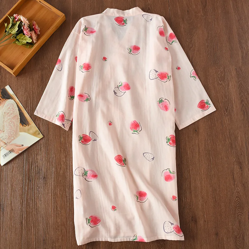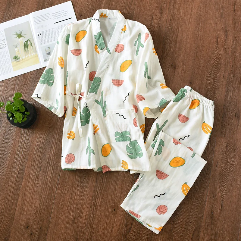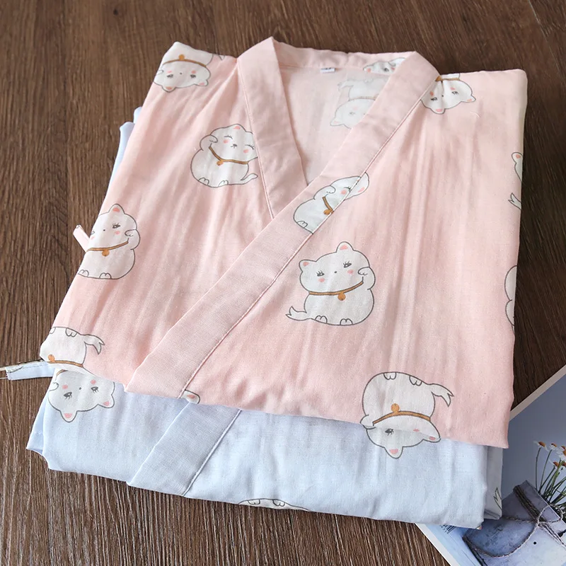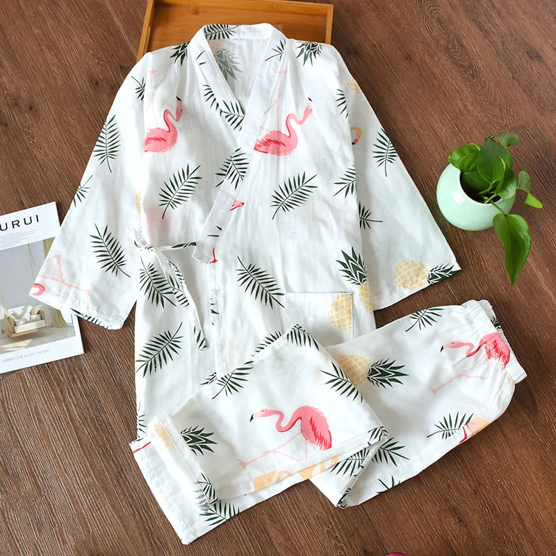 Женский хлопковый пижамный комплект, сезон весна-лето-осень, двухслойные хлопковые марлевые брюки с рукавом средней длины, кимоно, тонкий костюм для домашнего использования