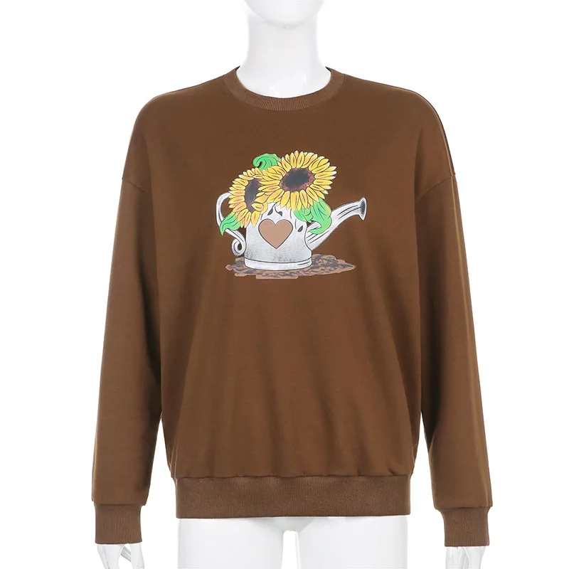 Y2K, коричневый Повседневный свитшот с круглым вырезом, Женский Осенний Модный пуловер с принтом, свитшот с длинным рукавом, Корейская уличная одежда