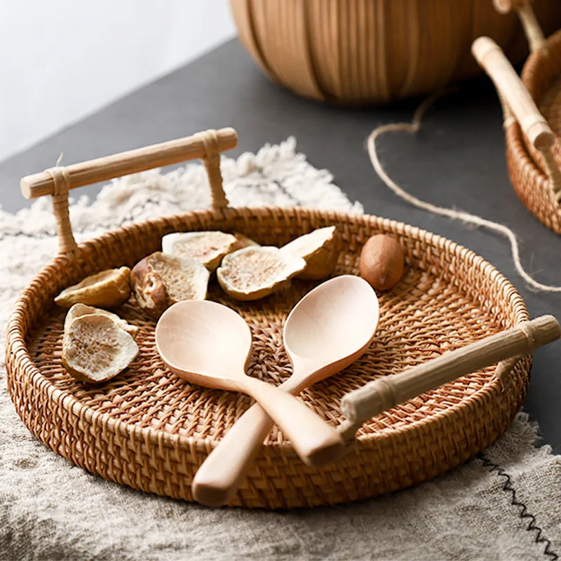 Плетеный ротанговый поднос для хранения, деревянная круглая плетеная корзина, тарелка для хлеба, пищи, фруктов, тортов, сервировочный лоток, 22-28 см