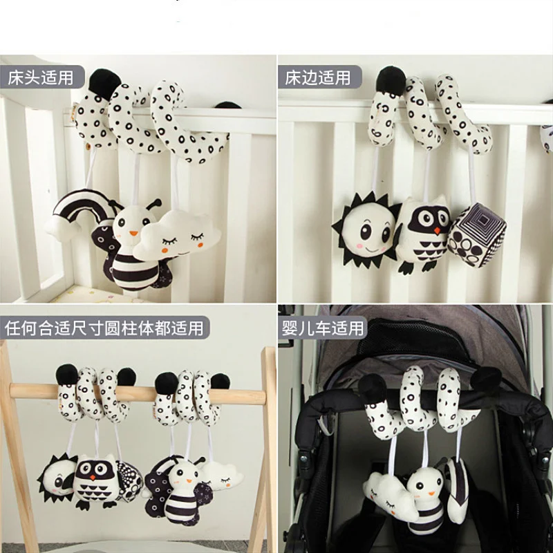 Специальный дизайн для малышей: дизайн мягкой коляски и черно-белая серия цветов, которая является специальной для ребенка, отвечает требованиям глаз ребенка и визуального зондирования, может сделать приятный звук, чтобы стимулировать внимание малышей, легко растягивается и собирается в кроватку, Можно использовать в качестве украшения для кроватки и защитного устройства для предотвращения травм ребенка, комфортного сна.