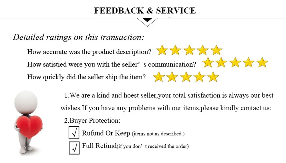 Если вы не удовлетворены товаром, мы обработаем возврат средств после того, как вы вернули товар, но стоимость доставки будет на вашей стороне. Если товары имеют проблемы с качеством, мы доставим еще раз или вернем деньги. Есть какие-либо проблемы с товарами, которые вы привезли у нас,Пожалуйста, свяжитесь с нами.