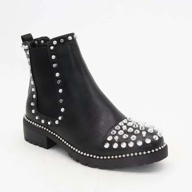Женские ботинки челси с заклепками, кожаные ботинки в стиле панк, с круглым носком, на толстом низком каблуке, с шипами и плюшевой подкладкой, зима 2022