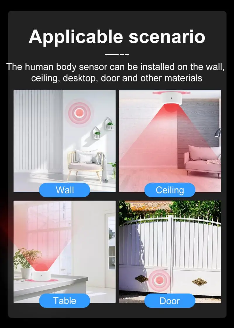 【Advanced Motion Sensor】PIR обнаруживает тело человека или животных, которые движутся, угол обнаружения 120 °, расстояние обнаружения 5 м, может достигать мониторинга в реальном времени днем или ночью.
