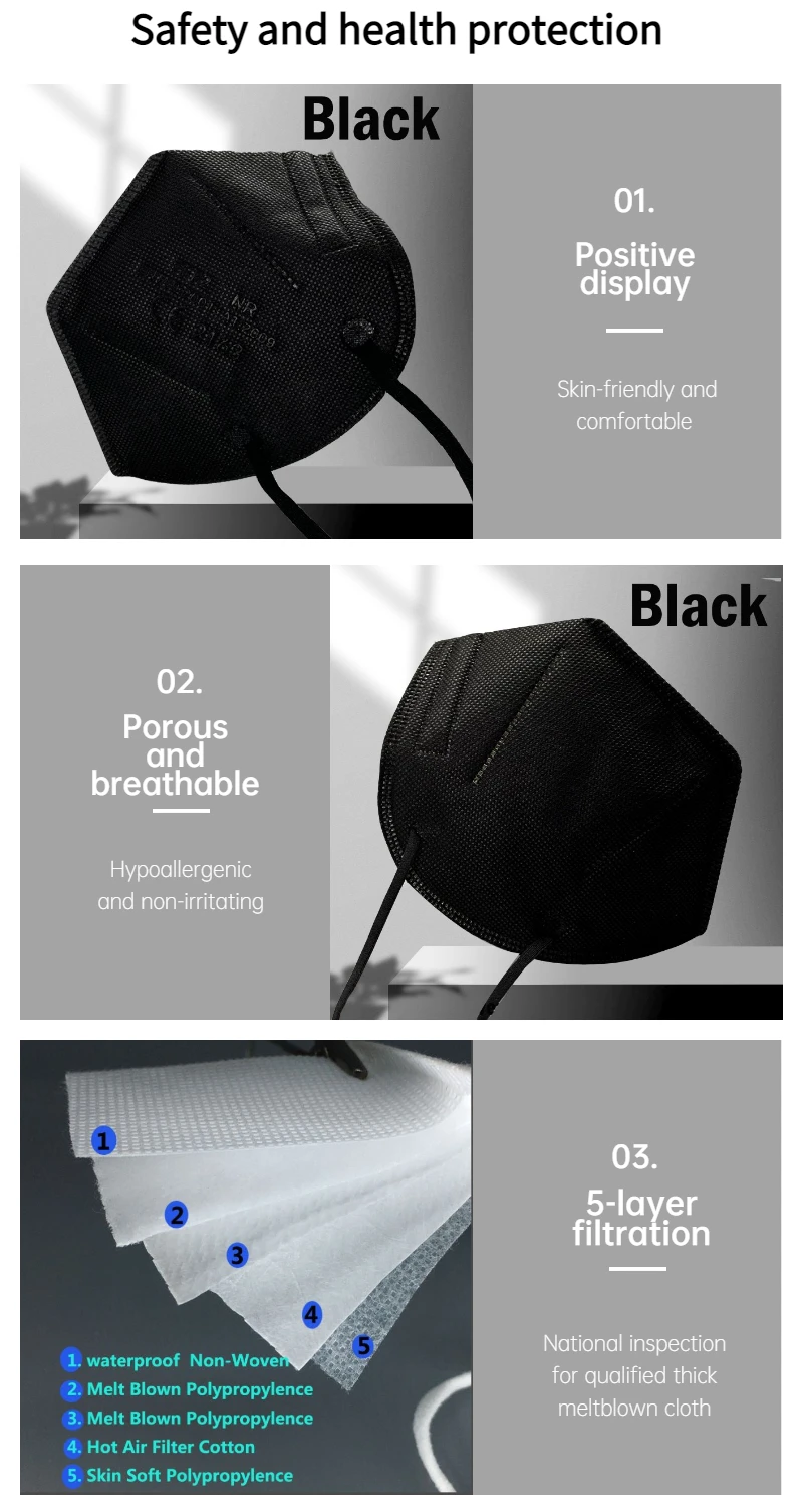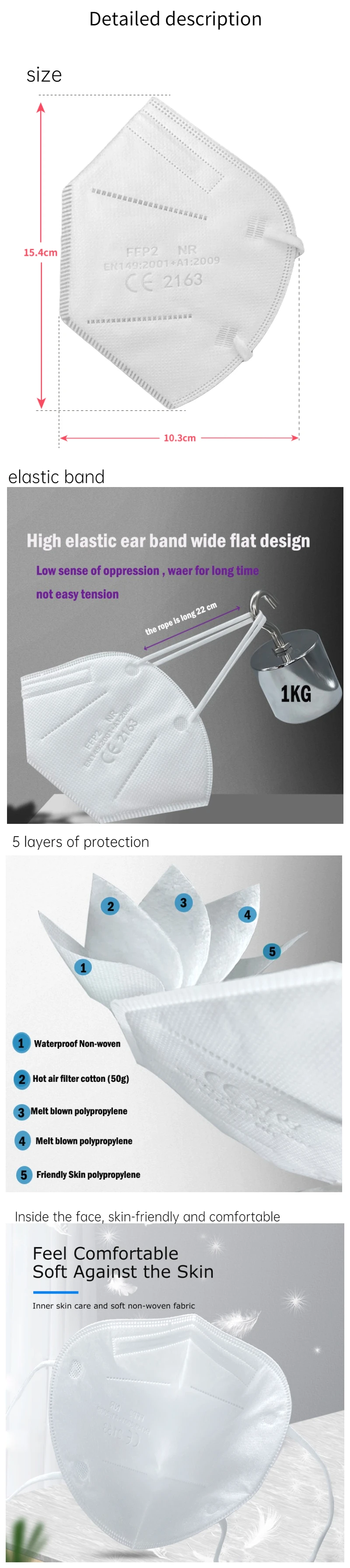 Упаковка: 10 шт. в упаковкеМатериал: Нетканая ткань + расплавленная ткань + утепленный хлопокСтандарт: FFP2 EN 149-2001 + A1-2009Класс защиты: маска kn95 ffp2Скорость фильтрации: ≥ 95% (0,075мкм частиц)Уникальный дизайн: губная помада трудно приклеить к маске.Применение: Повседневная жизнь, Заводская мастерская, спа, школа, рабочие места и т. Д.