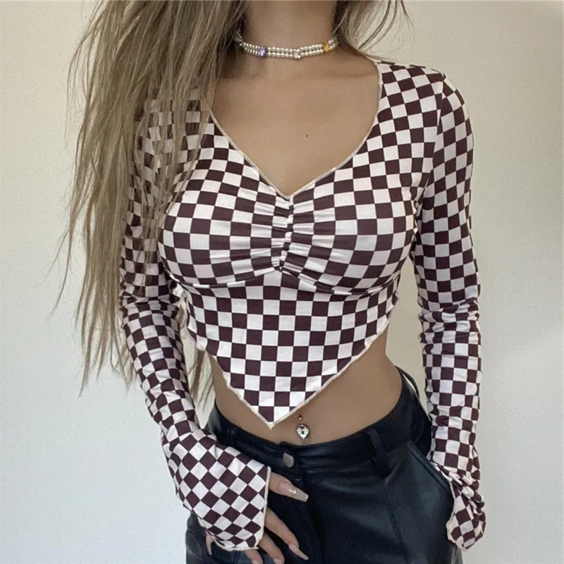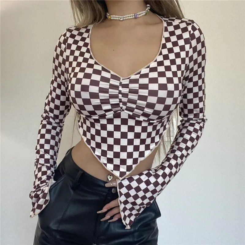 Женские короткие топы с принтом в клетку, укороченные топы с длинными рукавами и V-образным вырезом, асимметричный треугольный подол