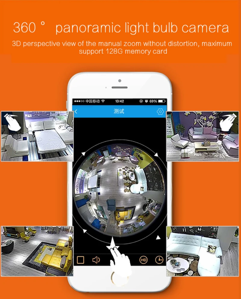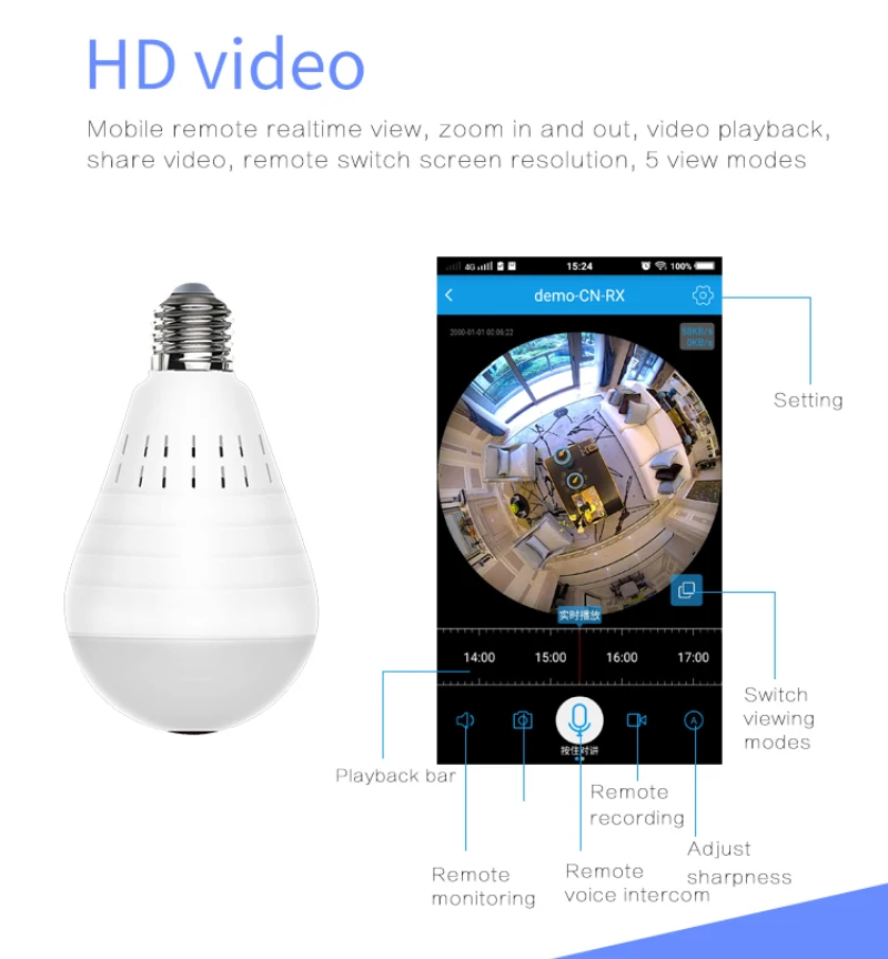 3. Простая система для установки, просто положив в общее сопло лампы. Это размер и форма обычного дискретного светодиодный лампы. Подключение к сети Wi-Fi и через приложение вы можете просматривать и взаимодействовать через ваш смартфон или планшет. Встроенный, само-говоря микрофон. Записывайте или фотографируйте в любое время на вашем телефоне или планшете (не входит в комплект micro sd). Разрешение: 960P.