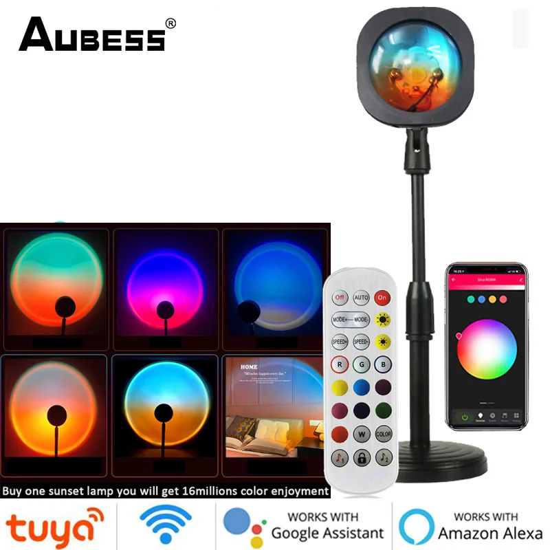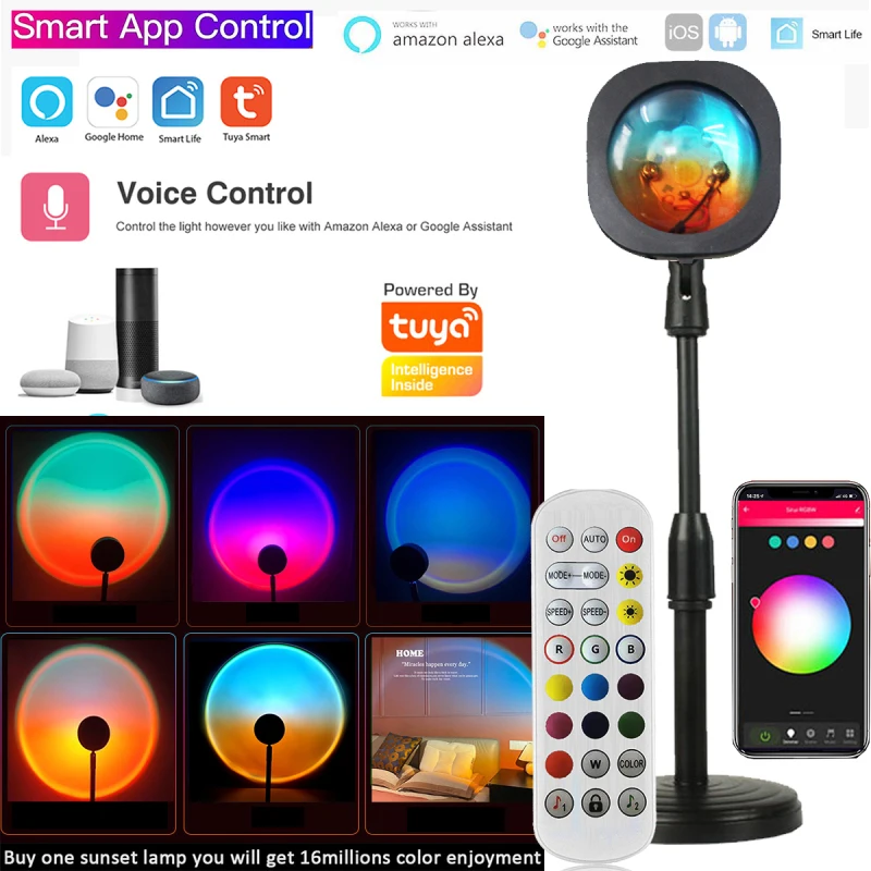 TUYA WiFI Светодиодный проекционный свет восхода солнца, эти огни проектируют удивительные круговые огни на стенах, потолке и полу. Он может управляться через приложение «Мобильный телефон», управляемое прикрепленным пультом дистанционного управления, может управляться голосом (Alexa, Google Assistant), или может быть приурочен, и может быть связан с другими устройствами для создания умных сцен.