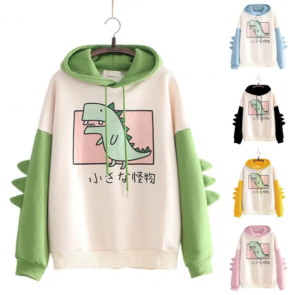 Женская толстовка с капюшоном, свободная теплая толстовка контрастных цветов с принтом динозавра для повседневной носки