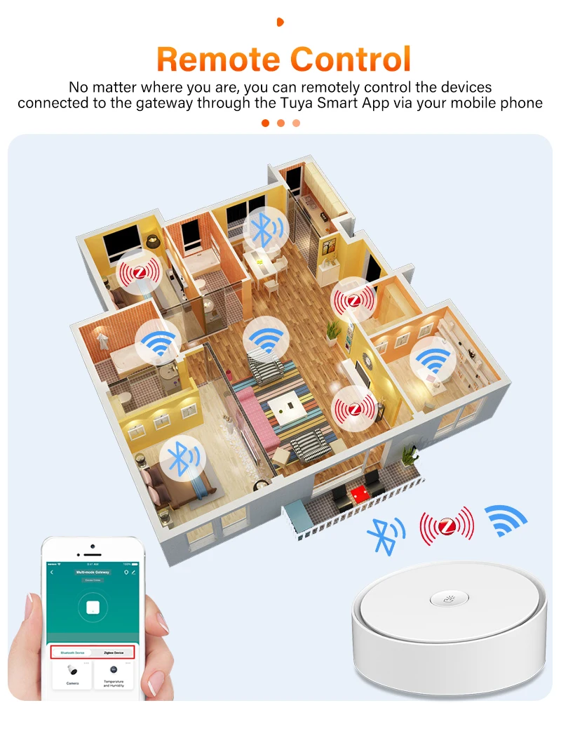 3. Пульт дистанционного управления: удаленно Управляйте устройствами, которые подключены к шлюзу через мобильный телефон через приложение Tuya Smart независимо от того, где вы находитесь, нет необходимости отдельно управлять устройствами Bluetooth и ZigBee в двух разных интерфейсах, просто Управляйте ими в одном многомодовом шлюзе с надежной локальной связью и поддержкой группового управления.