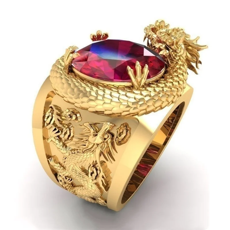 Кольца мужские с красным камнем, с инкрустацией, золотой дракон