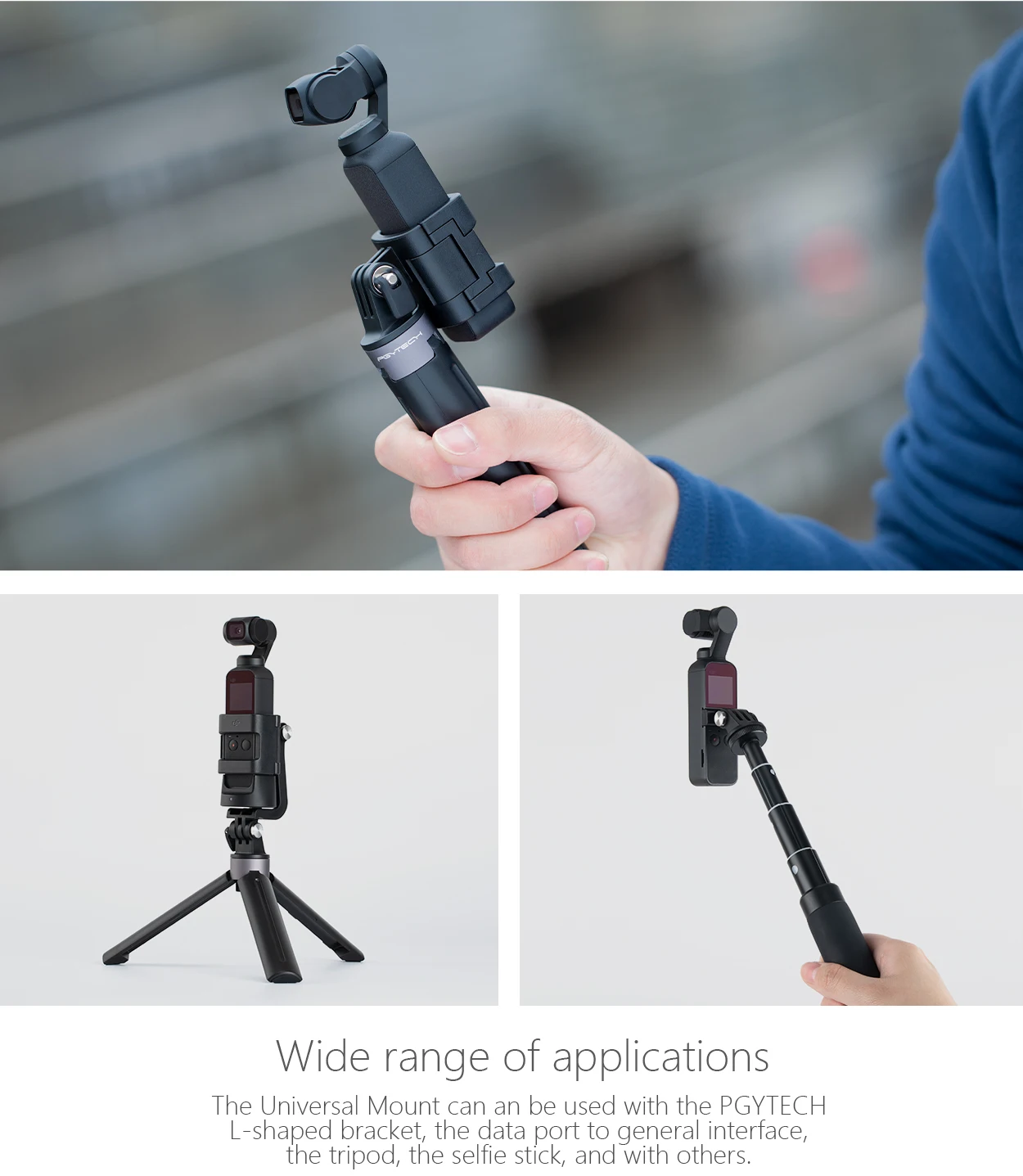 ● Широкий спектр аппликаторов Универсальное крепление может использоваться с l-образным кронштейном PGYTECH, портом передачи данных для общего интерфейса, штативом, селфи-палкой и другими