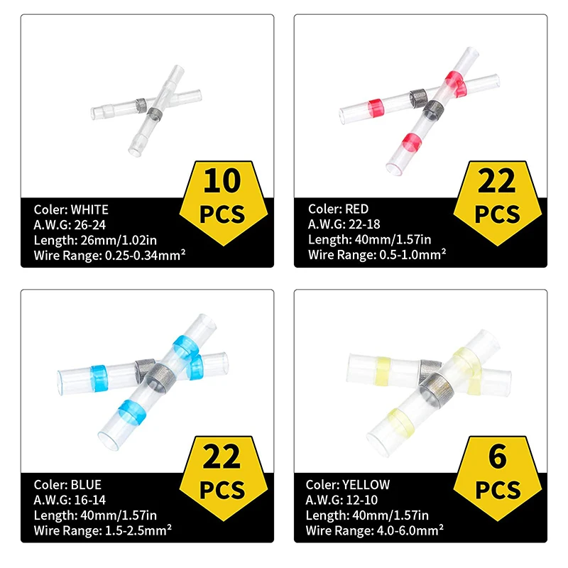 -Легкий и быстрый процесс: все-в-одном шаг припоя и процесс уплотнения. Нет необходимости в обжимных инструментах и паяльной машине. Таймер и беспорядок -Водонепроницаемость и изоляция: конструкция с двумя стенками-наружные полиолефиновые трубки обеспечивают изоляцию и повышают прочность на изгиб; Термоплавкий клей и припой внутри обеспечивают плотное соединение проводов и позволяют избежать выскальзывания проводов из терминала -Будьте организованны: Наши разъемы поставляются в ящике для хранения, легко хранить и переносить. Цветная трубка позволяет легко определить правильный размер соединителя для каждого применения -Широкое применение: Коэффициент усадки: 3:1. Идеально подходит для автомобилей, лодок, морских и других видов применения на открытом воздухе