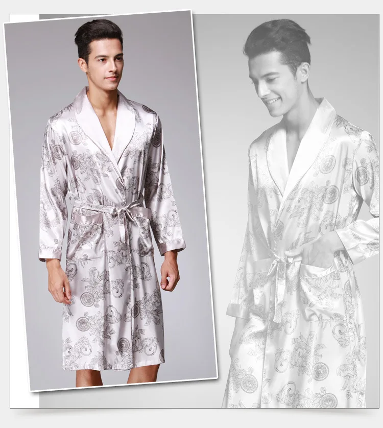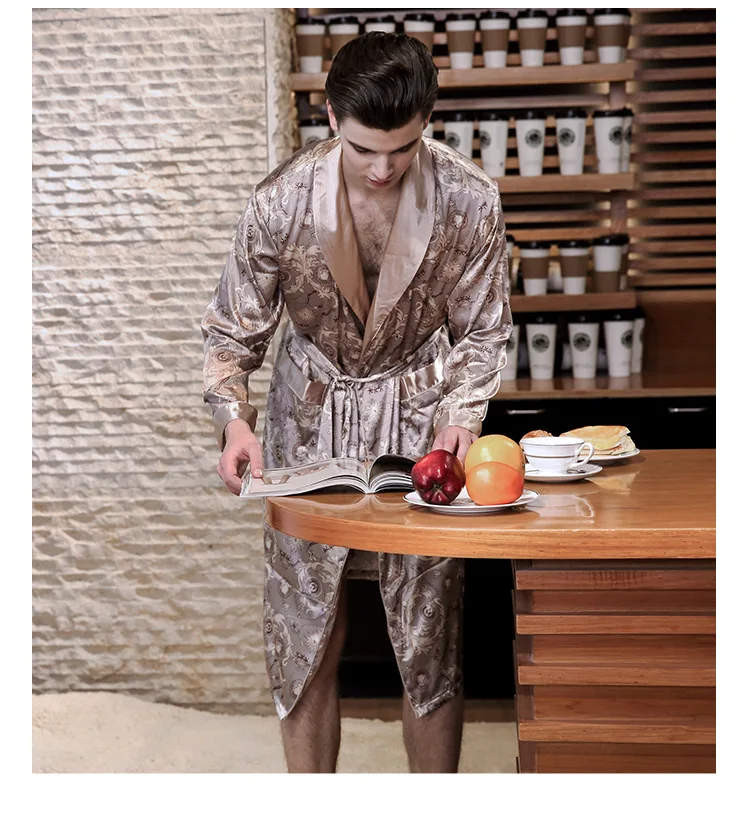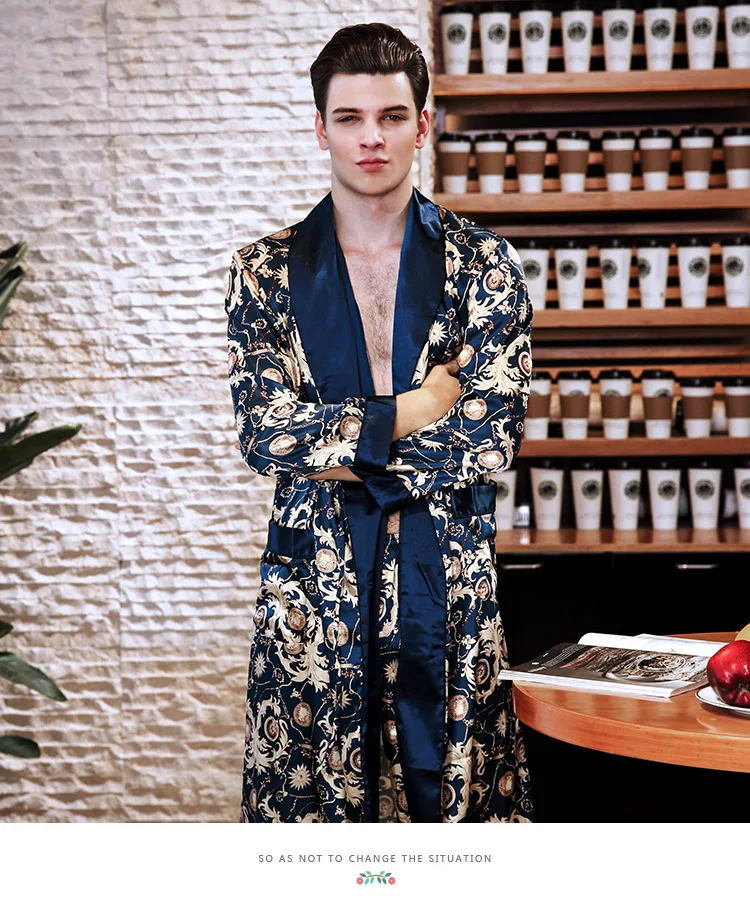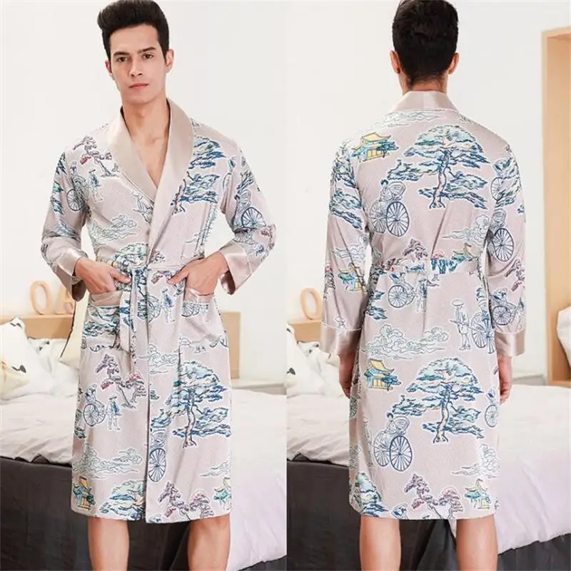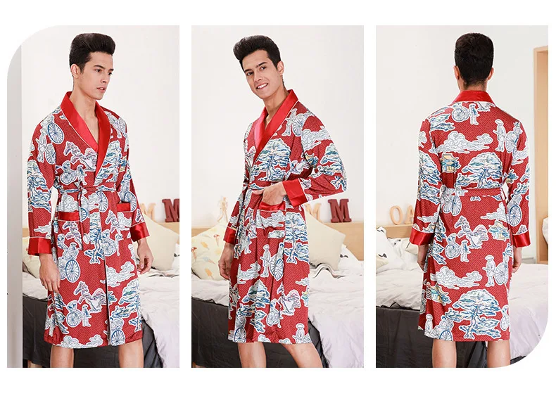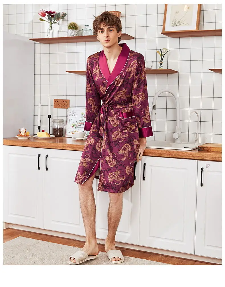 Халат Kwyaster Мужской Атласный с длинным рукавом, пижама с принтом дракона, кимоно с Фениксом, халат, Повседневная Домашняя одежда, свободная Пижама