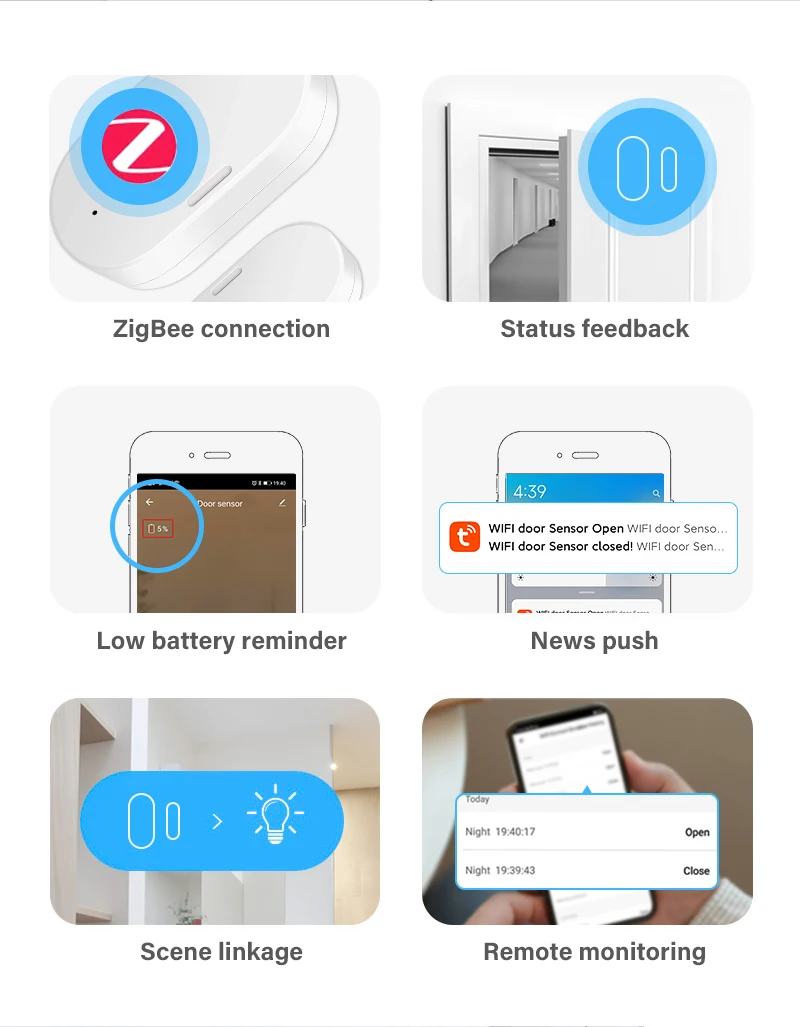 Когда в доме нет человека, если кто-то хочет принудительно открыть двери и окна, датчик двери может быть обнаружен и толкать сообщения через приложение. Сообщите пользователям вовремя, чтобы защитить вашу семью.