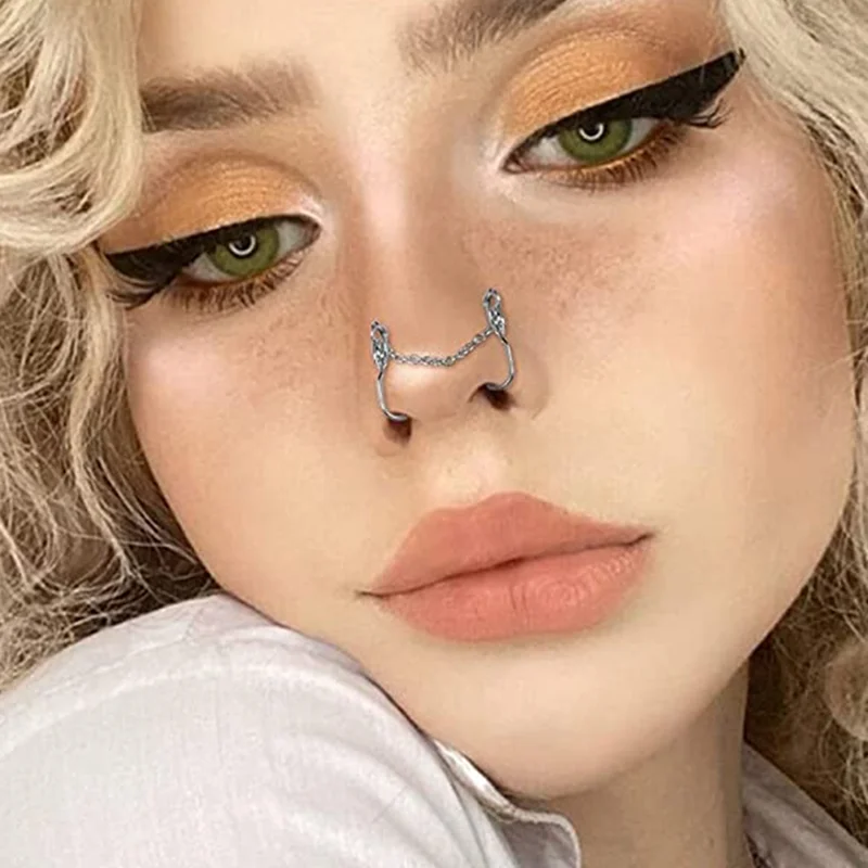 100% новый и высокое качествоТовар: поддельная цепь на нос манжетыМатериал: хирургическая стальЦвет: серебристый, черный, золотойПосылка включает в себя: как показаноРазмер: один размер для всех