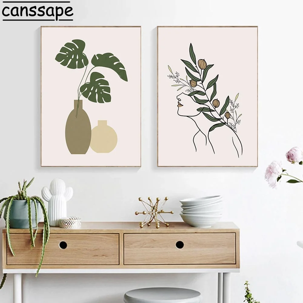 Бохо ваза Monstera растительный лист настенный художественный плакат абстрактная линия Картина на холсте «женщина» скандинавские настенные картины для декора гостиной