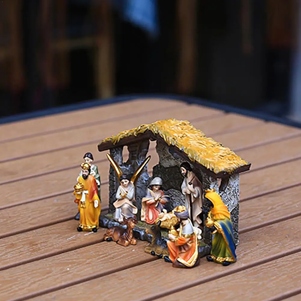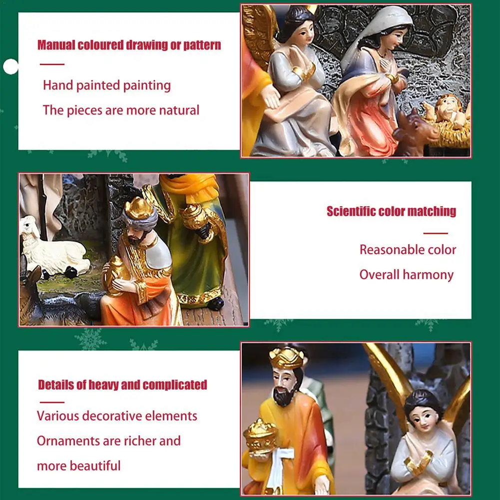 Стабильный Рождественский комплект сделан из качественной смолы и деревянных материалов. Это безопасно, надежно, экологично и долговечно для длительного использования. Осмысленный и священный дизайн делает его полон религиозного значения. Он подходит для тех, кто поклоняется и уважает Иисуса, чтобы украсить свои дома, магазины, офисы, гостиные, настольные компьютеры, полки, сады и дворы и т. Д.