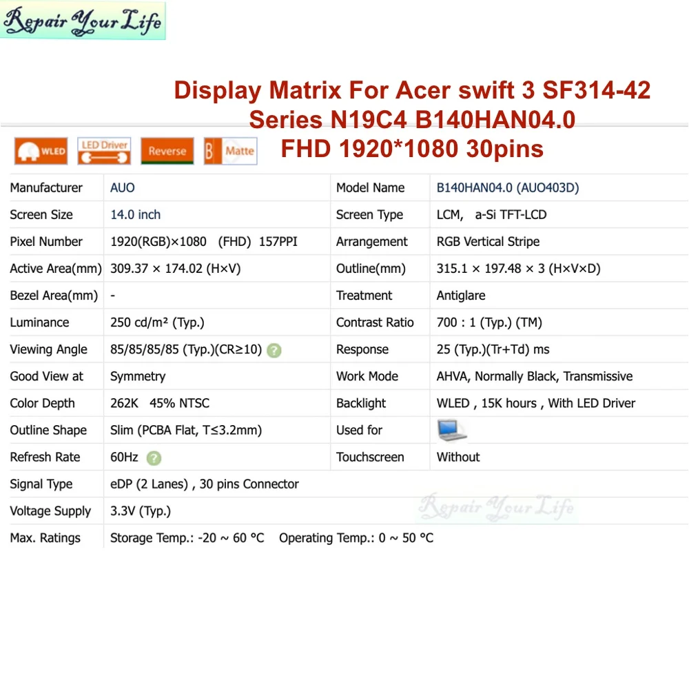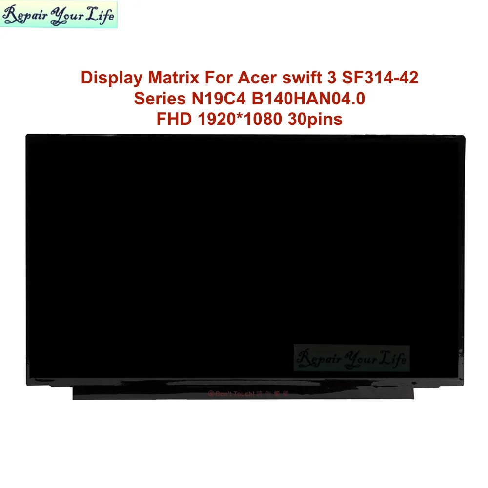 Для Acer Swift 3 SF314-55 NON-TOUCH TravelMate X514-51SF314-55GSF314-57GSF314-42 N19C4Совместимый номер ЖК-дисплея:B140HAN04.0 N140HCE-EN214,0 "FHD ЖК-экран для ноутбукаТип сигнала: EDPВидео разъемы: 30pin правый низСенсорная Функция: без, без касания