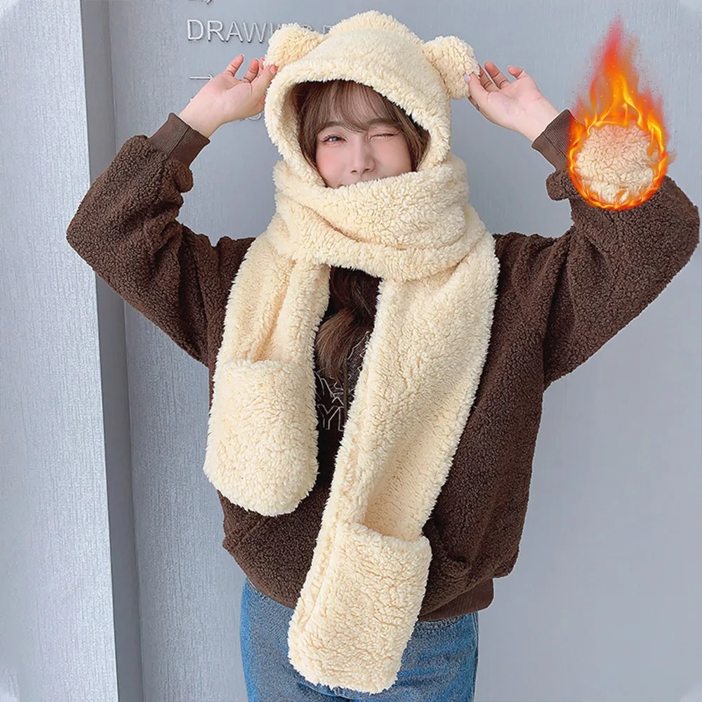 2021 Милая Балаклава с ушками зимняя шапка женская шапка с капюшоном для девочек шапки с медведем ушками Толстая плюшевая шапка шарф перчатки набор однотонный подарок