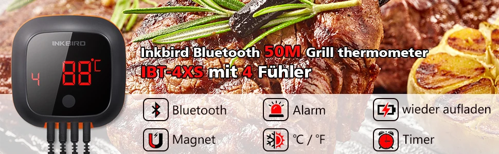 ВIBT-4XS InkbirdЭто цифровой беспроводной bluetooth-термометр с таймером, который встроен в литиевую батарею емкостью 1000 мА · ч, магнитной и вращающейся функцией чтения экрана. В комплект входит Зонд из нержавеющей стали, который поможет вам одновременно контролировать температуру мяса и печи/курильщика. Сигнализация перегрева, диапазон и время отсчета сигнала тревоги сделают гриль легким даже для начинающих. С диапазоном до 150 футов/50 м, это может позволить вам контролировать ваше мясо и температуру курильщика из любой точки вашего дома. И вы можете развлекать друзей, готовить другую еду или спать. IBT-4XS Inkbird не только поможет вам вкусно готовить, но и позволит вам комфортно и сэкономить время. И это лучший выбор для праздничного подарка.