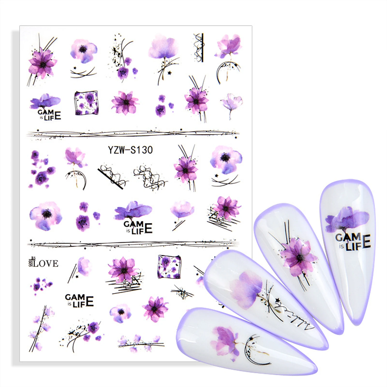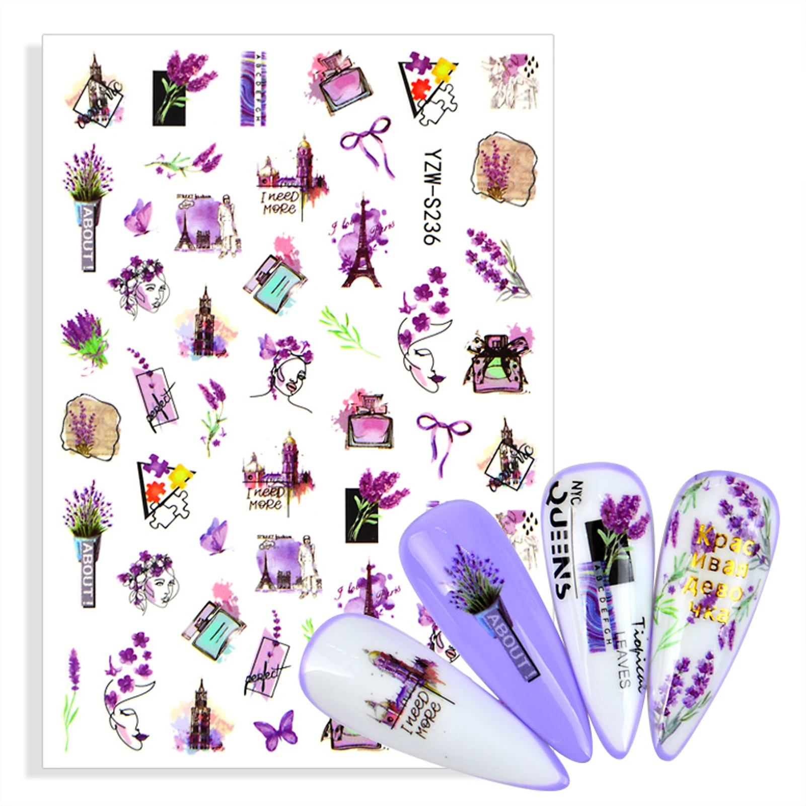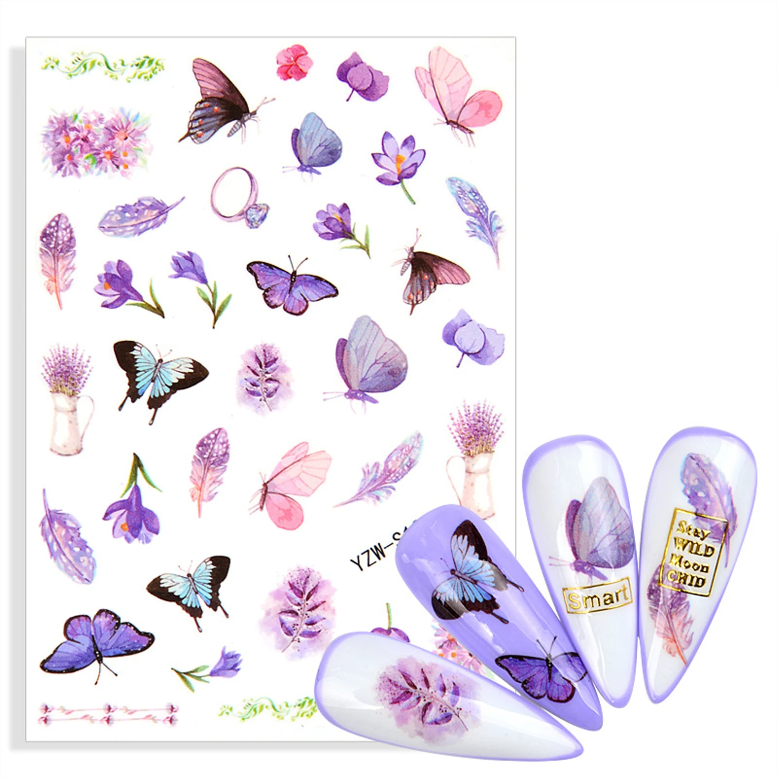 3D фиолетовые цветы наклейки для ногтей Лаванда голубая бабочка цветочные листья Переводные слайдеры наклейки для ногтей