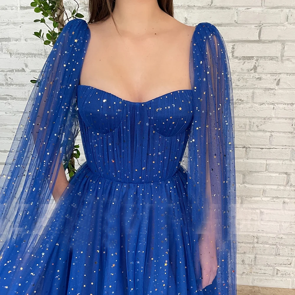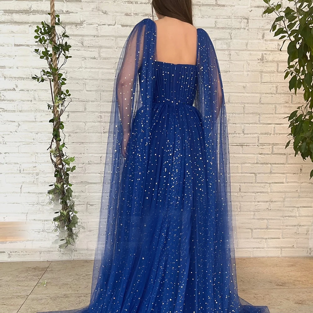 Блестящее Тюлевое вечернее платье Королевского синего цвета, элегантное милое платье А-силуэта для выпускного вечера, женское вечернее платье с накидкой, вечернее платье