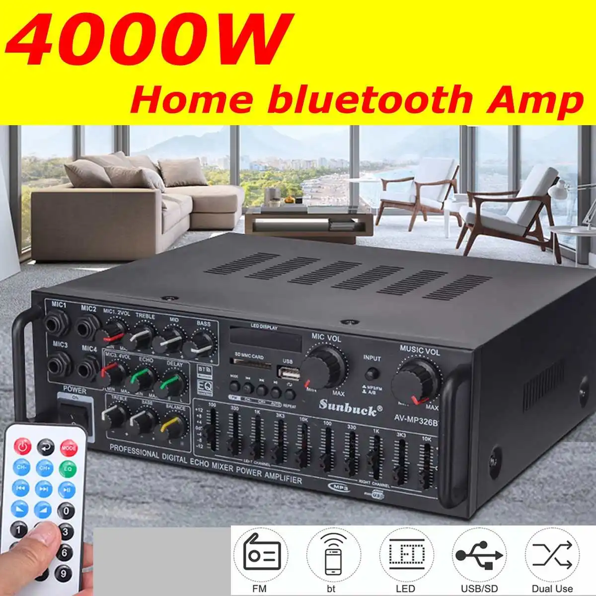 Особенности:-HIFI Цифровой bluetooth аудио усилитель мощности.-Встроенный большой ЖК-дисплей, более удобный в использовании.-Интерфейс bluetooth для потоковой передачи музыки через мобильный телефон.-Слот USB / SD для воспроизведения MP3 с карты памяти или карты.-Поддержка 4 способа вход для микрофона.-Поддержка 10-полосным эквалайзером управления.-Поддерживает fm-стерео радио.-С отдельной громкостью, настройкой и управлением микрофоном, очень прост в использовании.-Низкое Искажение обеспечивает более четкий, сильный и мощный звук.-2 канальный выход.-С функцией дистанционного управления.-Питание постоянного/переменного тока, подходит для домашнего использования в автомобиле.-Подходит для HiFi, систем домашнего кинотеатра и караоке.