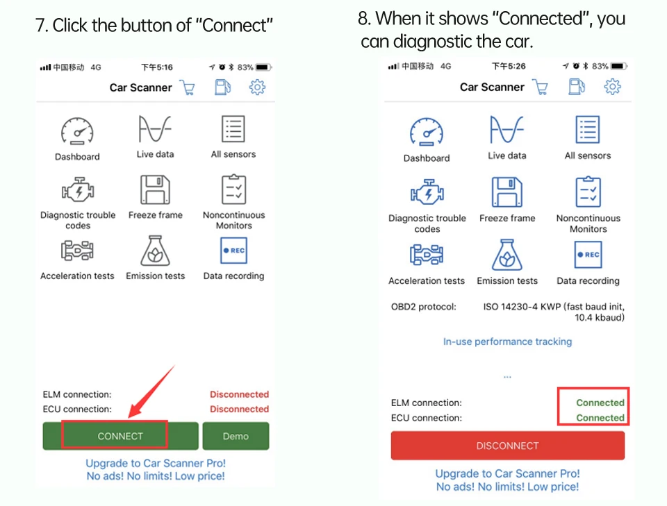 1 Установите приложение:Отсканируйте qr-код в инструкции по продукту и загрузите приложение. (Метод загрузки прочитайте Руководство: пользователи iOS рекомендуют использовать «Автомобильный сканер» или «OBD Car Doctor», пользователи Android рекомендуют использовать «Torque» или «OBD Car Doctor», вы также можете найти Название программного обеспечения в Google Play или Apple магазин для загрузки.) 2 разъема адаптера:Подключите адаптер в порт OBDII автомобиля, мигает светильник питания. 3 пары Bluetooth:Подключите продукт к Bluetooth или Wi-Fi, откройте загруженное приложение и установите способ подключения и устройство. (Пожалуйста, обратитесь к руководству для детальной работы) 4 подключения автоматически:При повторном использовании продукта, после подключения к стандартному интерфейсу OBDII автомобиля, запустите автомобиль, откройте приложение, оно будет подключено автоматически, нет необходимости проверять снова.