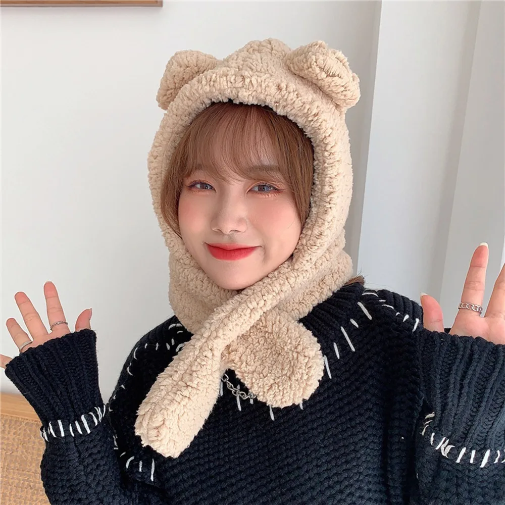 Милая шапка-ушанка с медведем, Балаклава с ушами, теплая зимняя шапка, Женская Шапка-бини с капюшоном для девушек, Повседневные Плюшевые шапки-бини с шарфом, подарок, уличная одежда