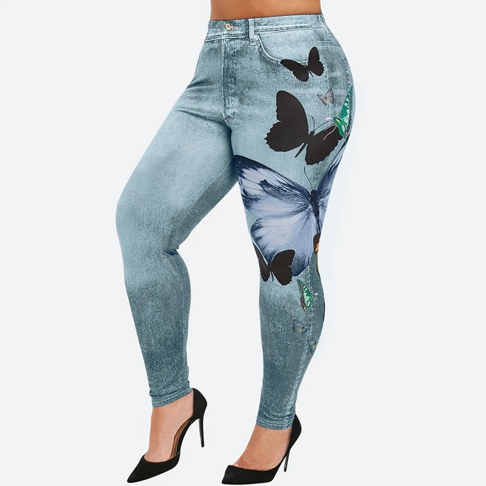 Удобные облегающие брюки, Джинсовые леггинсы с принтом бабочки, женские джинсовые леггинсы, ковбойские эластичные облегающие леггинсы, размеры 5XL