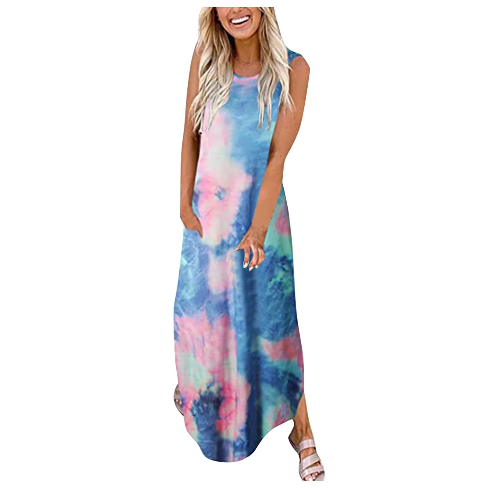 Женское свободное пляжное платье макси без рукавов с карманами и цветочным принтом