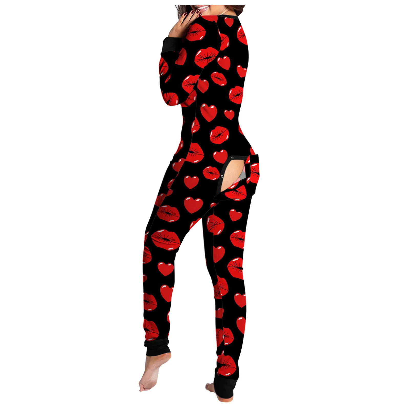 Пикантный женский Пижамный комбинезон, комбинезон с пуговицами на спине, с открытой задней частью, комбинезон с клапаном, комбинезон с принтом в виде сердца, боди