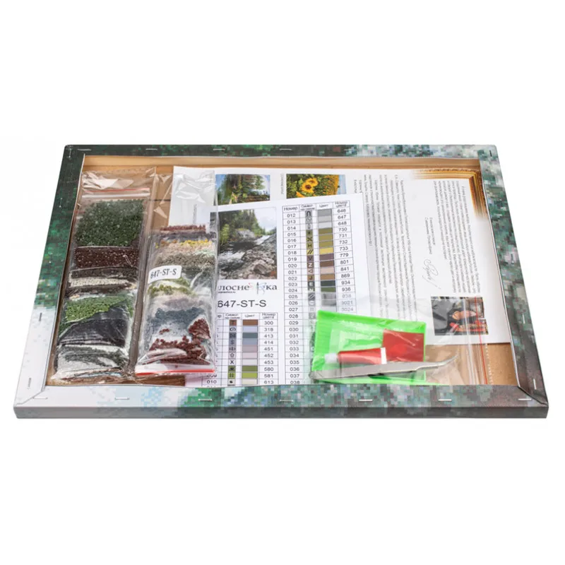 Блестящая картина из квадратных камней 2,5*2,5 мм. в размере 30*40 см. Основа картины – холст, натянутый на подрамник, для придания крепости конструкции подрамник усилен листом оргалита. На холст нанесена цветная схема с контрастными условными обозначениями, схему покрывает высококачественный клеевой слой, сверху слой закрыт пленкой. Комплект квадратных камней расфасован по цветам в отдельные пакеты, на каждом пакете есть наклейка с номером цвета и условным обозначением. Материал камней – композитный, на основе эпоксидной смолы, благодаря форме камней картина собирается без зазоров и по готовности получается красивое мерцающее изображение. Для этого размера дополнительно можно приобрести багетную раму.