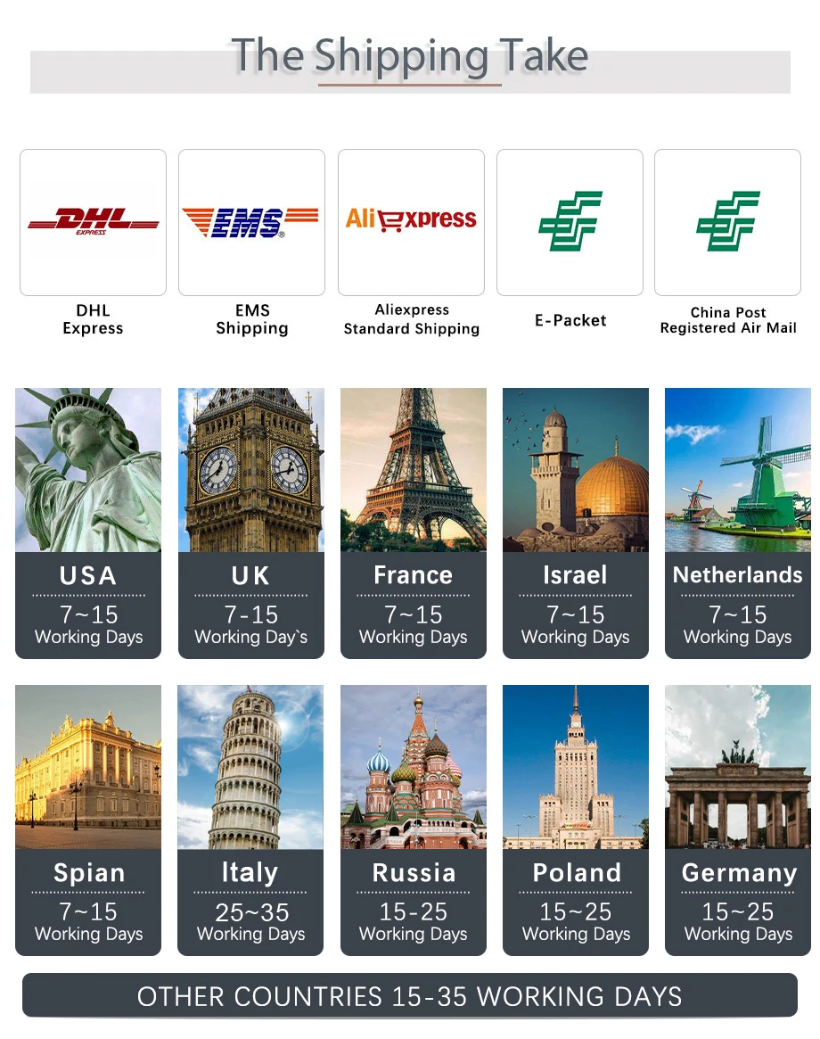 1. Обычно заказ будет отправлен в течение 1 рабочих дней после получения полной оплаты.2. В связи с таможней, погодой и т. д. посылка может задержаться, иногда это может занять немного больше времени, чтобы получить посылка, пожалуйста, свяжитесь с нами, чтобы продлить время защиты вашего заказа.